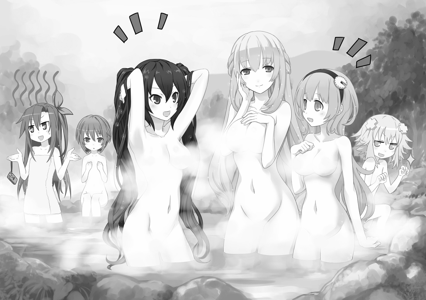 Neptune, Noire, Blanc, Vert, IF and Compa enjoying their time at a hot spring, which was created after Neptune defeated the rock monster present at the "Hyper Athletics Orientation", drilling through the ground and opening an underground hot spring. From Chou Jigen Game Neptune: High School