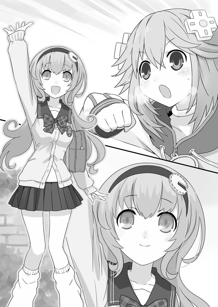 Neptune arriving just in time to the Histoire Memorial Academy entrance ceremony, while Compa waits for her at the gate. From Chou Jigen Game Neptune: High School