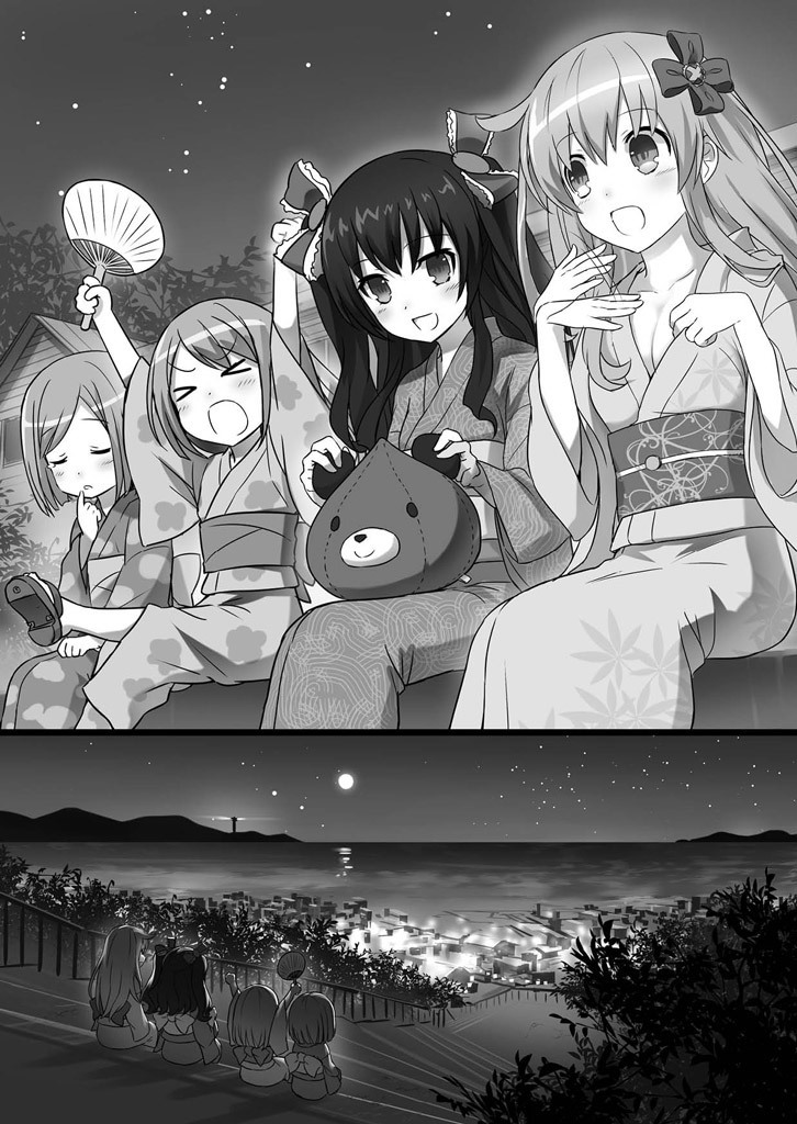 Otori Island holding a festival, after Nepgear, Uni, Rom and Ram saved Otori Island from a volcano eruption. From Chou Jigen Game Neptune: High School