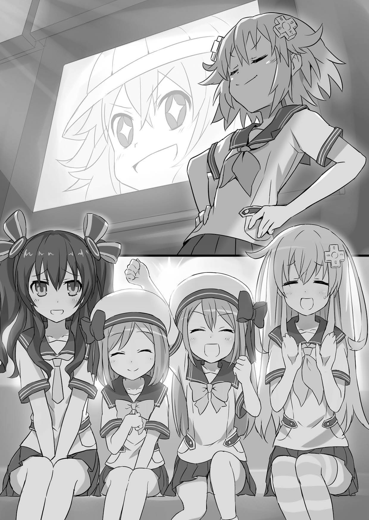 Neptune holding a presentation about their jungle adventure to Nepgear, Uni, Rom and Ram. From Chou Jigen Game Neptune: High School