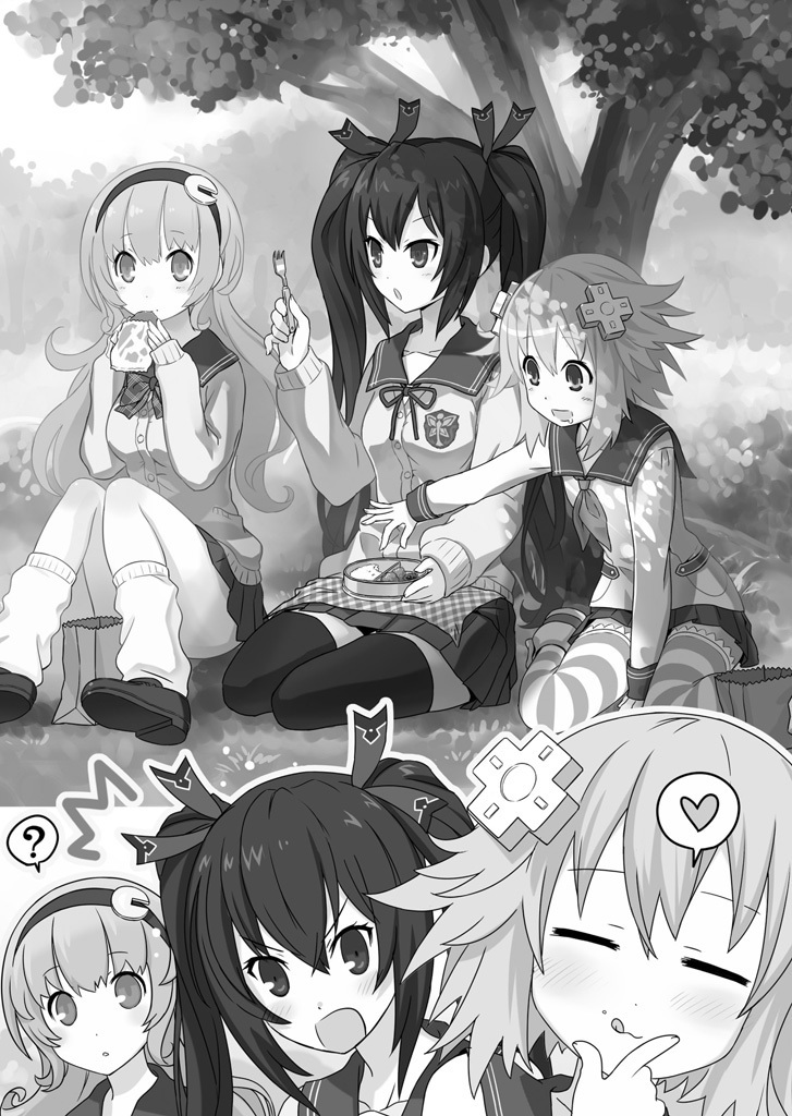 Neptune, Noire and Compa having lunch, while Neptune steals some from Noire. From Chou Jigen Game Neptune: High School