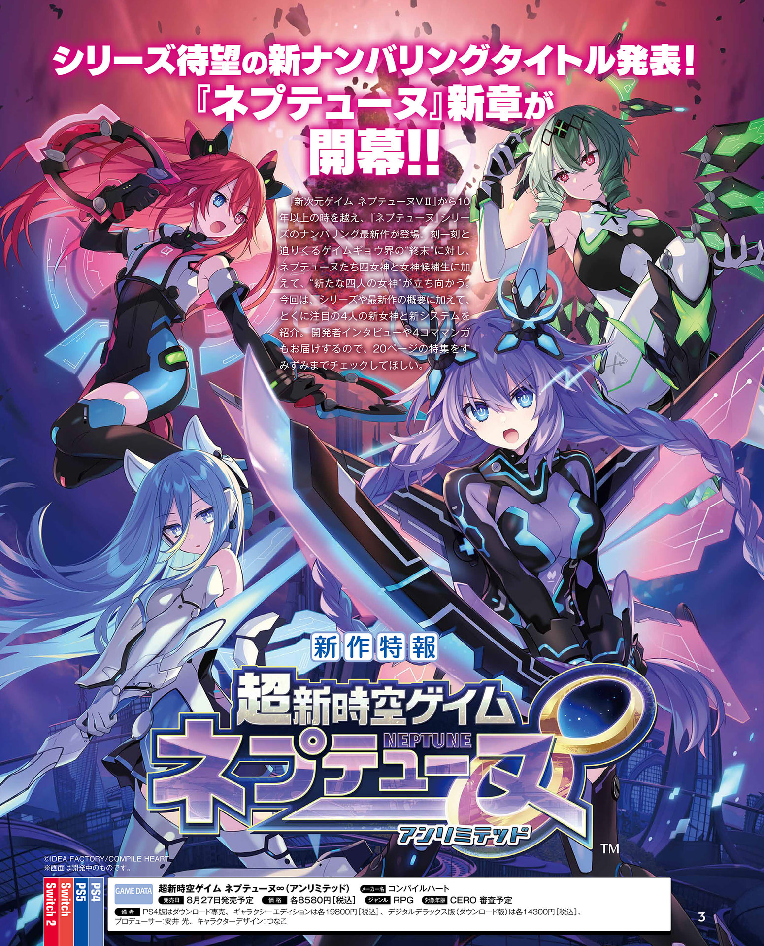 Cover art of Chou Shin Jikuu Game Neptune: Unlimited, in the Weekly Famitsu issue 1941, depicting Neptune, Ciel, Rouge and Eclipse Heart.