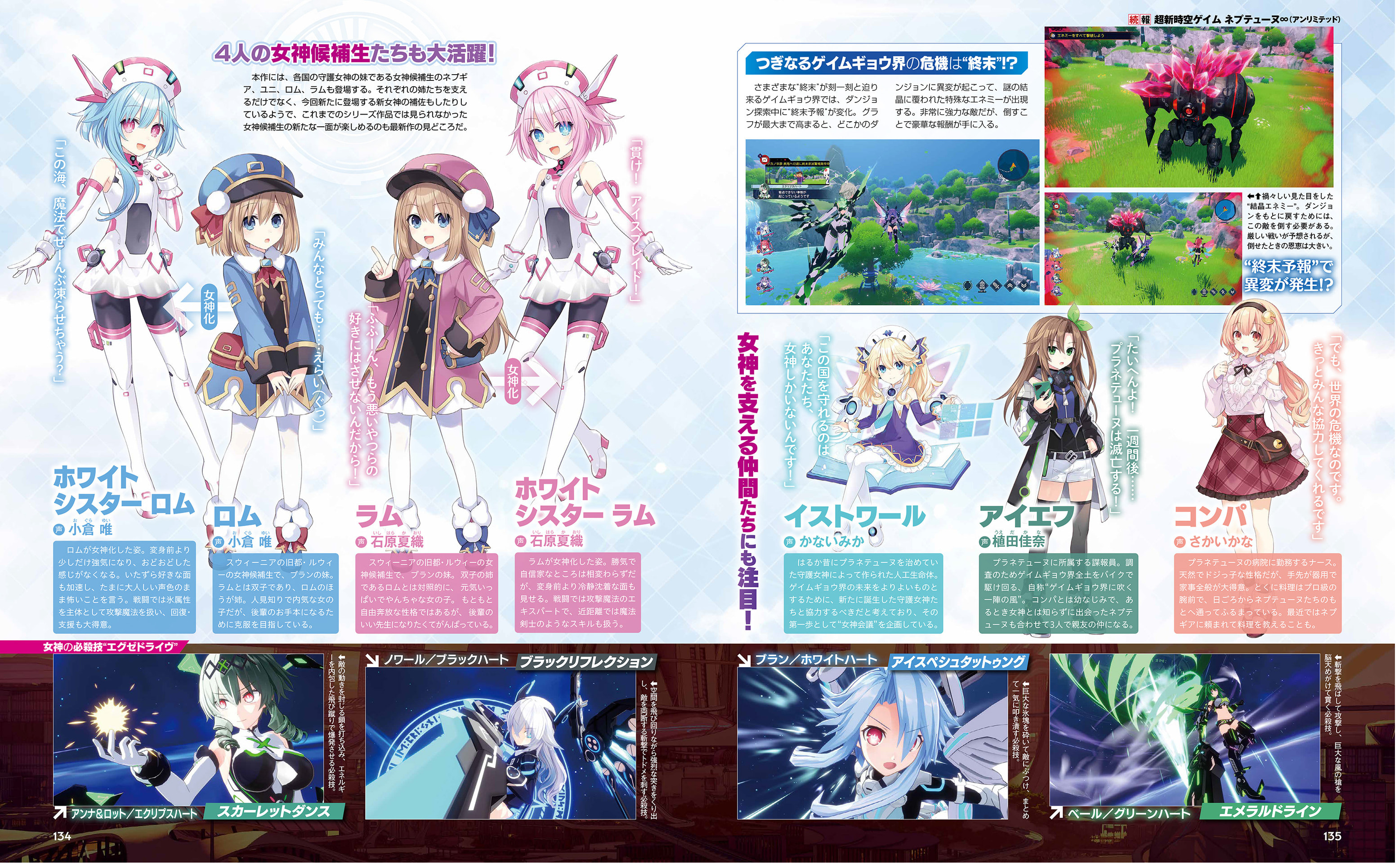 Double-spread page, from the Weekly Famitsu issue 1945, showing of the new designs of Rom and Ram in their human and HDD form, IF, Compa and Histoire in her old design.