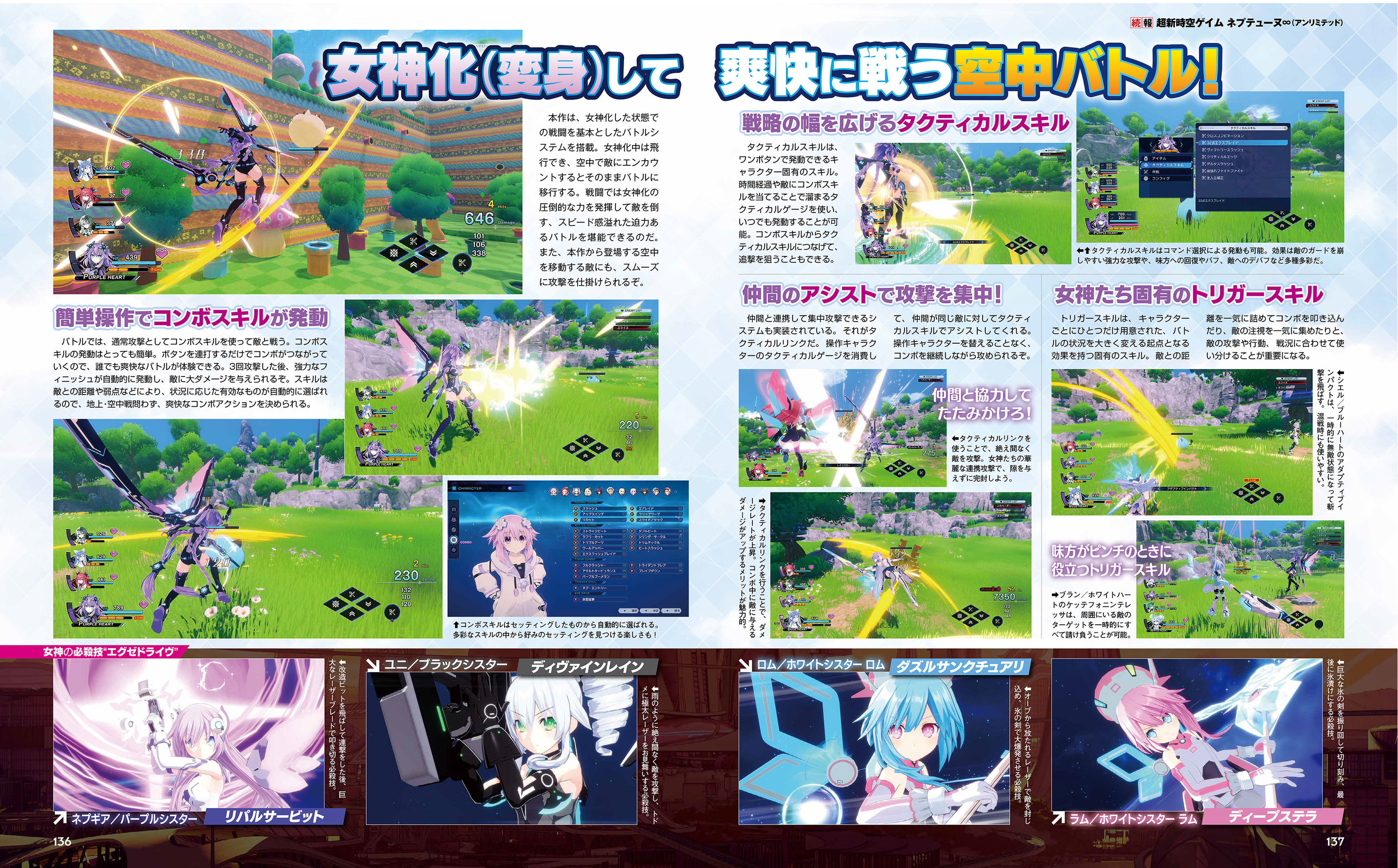 Double-spread page, from the Weekly Famitsu issue 1945, showing of the combat system of Chou Shin Jikuu Game Neptune: Unlimited.