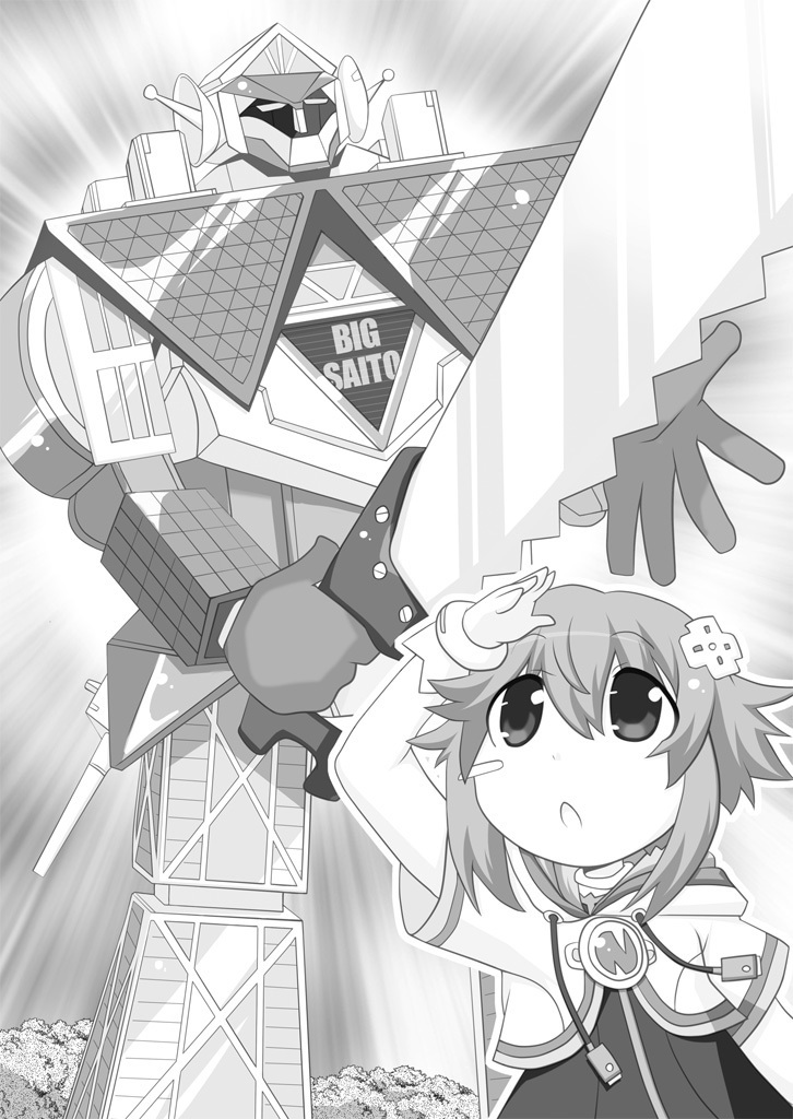 Illustration of Neptune with a big robot called "Big Saito", from the Hyperdimension Neptunia The Animation: TGS Honoo no Futsukakan novel.