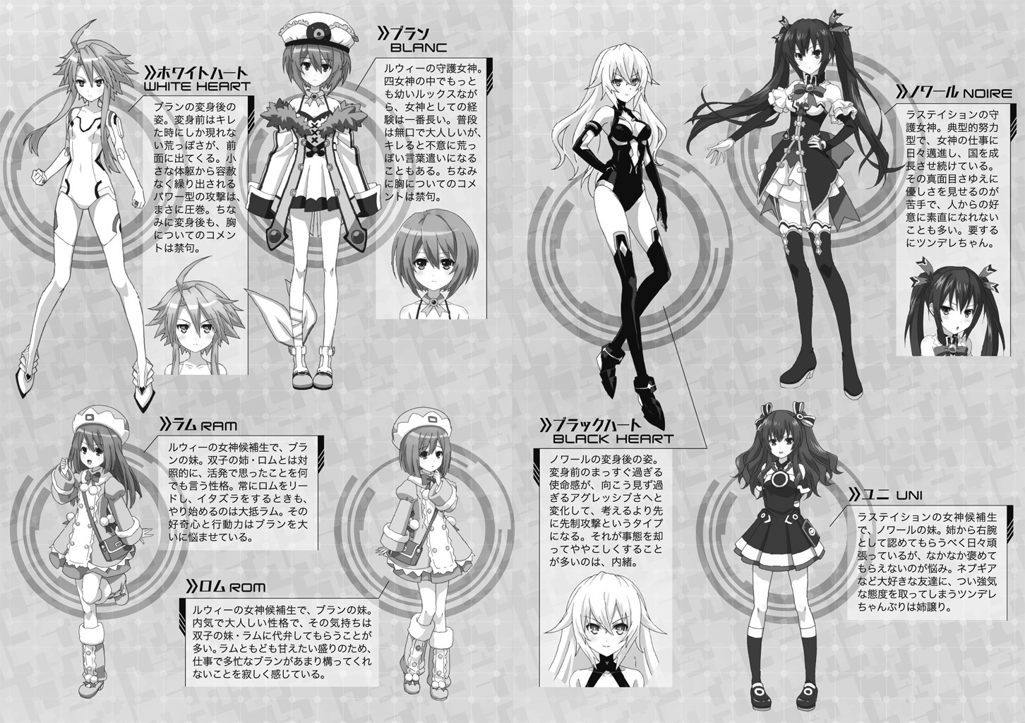 Introduction double page of Noire, Uni, Blanc, Rom and Ram from the Hyperdimension Neptunia The Animation: TGS Honoo no Futsukakan novel.