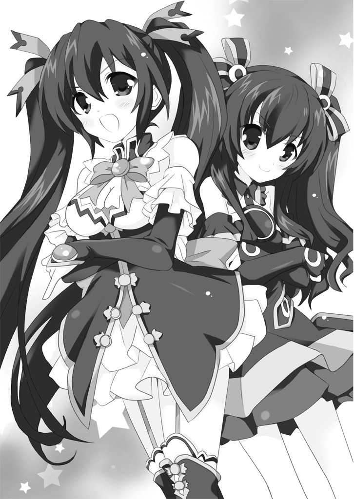 Illustration of Noire and Uni from the Hyperdimension Neptunia The Animation: TGS Honoo no Futsukakan novel.