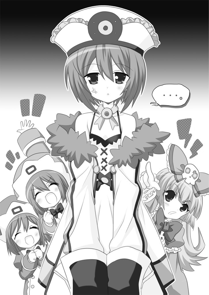 Illustration of a annoyed Blanc with Rom, Ram and Abnes behind her from the Hyperdimension Neptunia The Animation: TGS Honoo no Futsukakan novel.