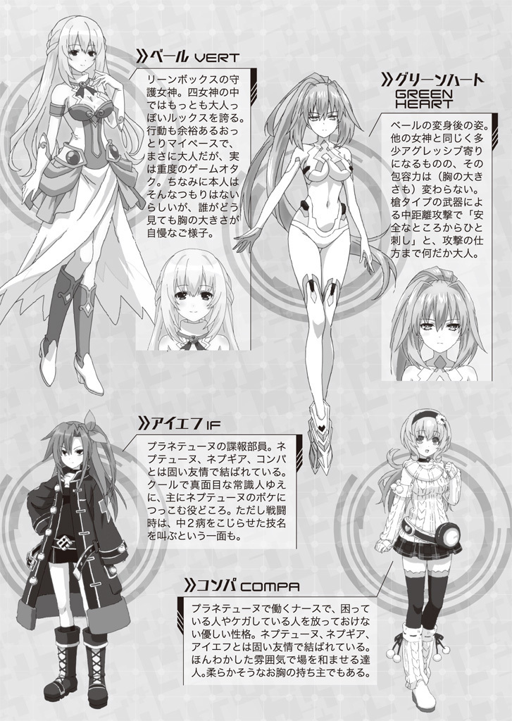 Introduction page of Vert, IF and Compa from the Hyperdimension Neptunia The Animation: TGS Honoo no Futsukakan novel.
