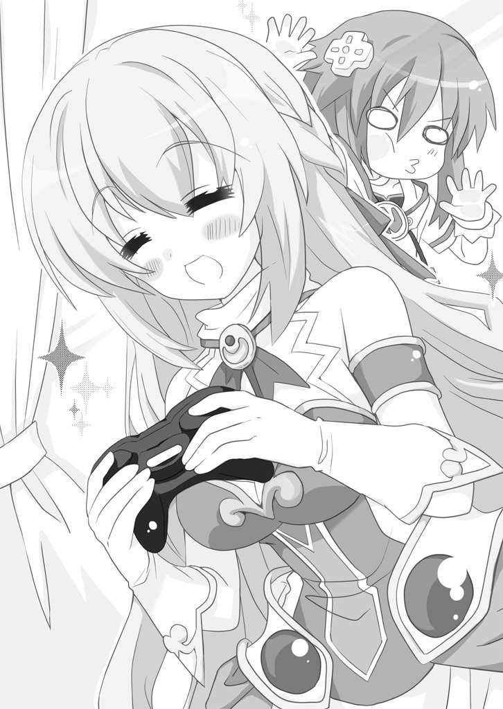 Illustration of Vert gaming, while Neptune is in the background from the Hyperdimension Neptunia The Animation: TGS Honoo no Futsukakan novel.