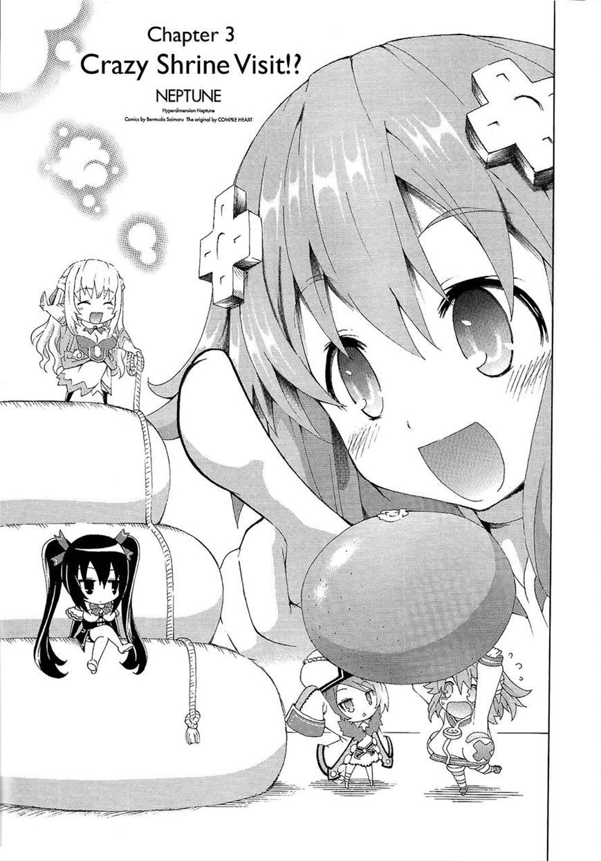It's New Year's Day and Neptune and Blanc sit under a kotatsu watching TV. Histoire appears and yells at Neptune for slacking off on her duties as a goddess and forces her to go out to the shrines and give an offering. After receiving the offering from Histoire which seemed to be nothing more than an orb of some sort, Blanc and Neptune make their way to the shrines where they see Noire dressed up in a Yukata. They ask why she's there and she explains that she's helping out and says Vert is there also. When they meet Vert she shows them the Lastation, Lowee, and Leanbox shrines and which makes Neptune struggle at a decision on which one to pick to give the offering too. Due to their being so many people around to visit the shrines, Neptune, Noire, Vert, and Blanc all dress up as staff members to move around the area more freely.